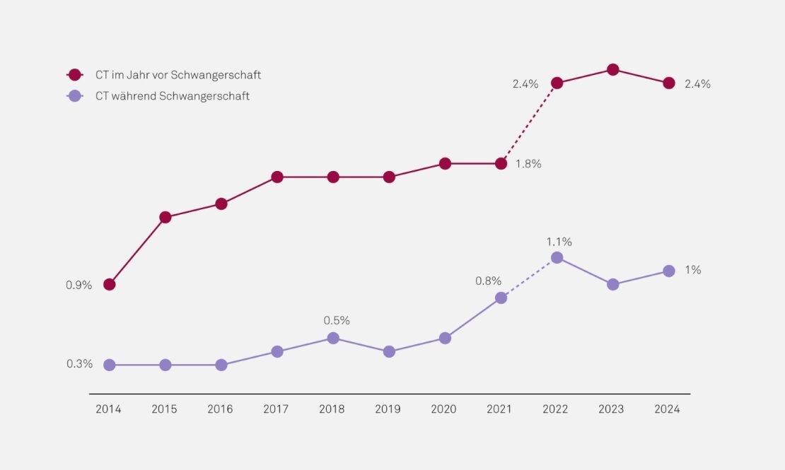 Bislang gab es in der Schweiz keine umfassenden Daten darüber, wie häufig CT-Untersuchungen vor oder während einer Schwangerschaft durchgeführt werden. Da das Durchschnittsalter von Frauen bei der ersten Geburt stetig steigt, nehmen auch chronische Vorerkrankungen und damit die Wahrscheinlichkeit einer CT-Indikation zu. Die Auswertung von Helsana bietet nun erstmals aktuelle Informationen zur Nutzung von CT vom Brustkorb bis zum Becken – sowohl bei schwangeren Frauen als auch bei Frauen im Jahr vor ihrer Schwangerschaft.