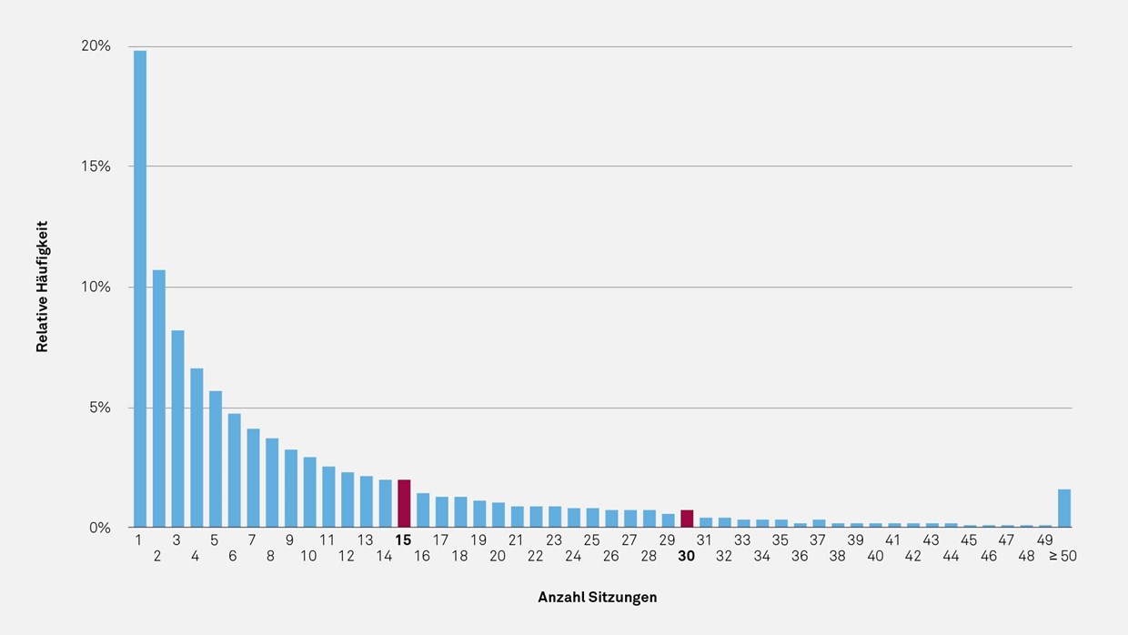 Rund 80 % der Patientinnen und Patienten benötigen weniger als 15 Sitzungen pro Jahr, nur 6 % überschreiten 30 Sitzungen. Helsana prüfte in den letzten zwei Jahren rund 5’500 Kostengutsprachen bei Patienten mit 30 Sitzungen, jede benötigt im Durchschnitt 35 Minuten Bearbeitungszeit. Das sind insgesamt 400 Arbeitstage. Müsste bereits nach 15 Sitzungen eine Kostengutsprache abgegeben werden, würde sich der Aufwand fast vervierfachen. Da fast alle Gesuche bewilligt werden, weil die Anträge grösstenteils die medizinischen Voraussetzungen erfüllen, entstünden enorme Verwaltungskosten ohne zusätzlichen Nutzen.